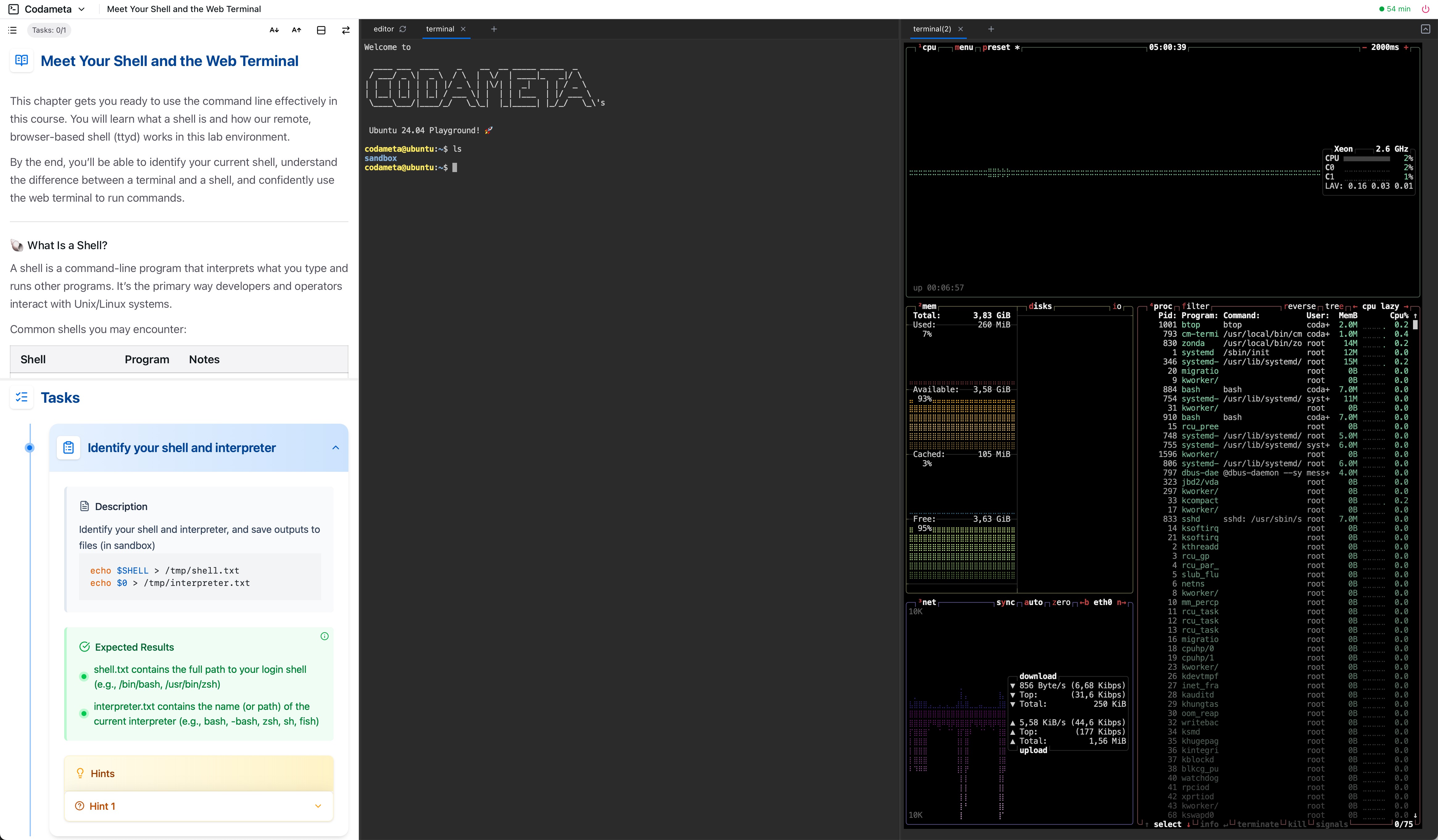 Every exercise runs in a live remote environment. You type real commands, see real output, make real mistakes — and actually learn from them.